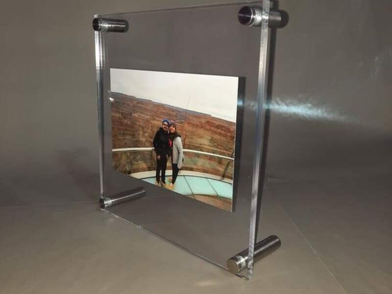Elegante Porta retrato de acrílico con soportes de chapeton, Cotiza los tuyos a la medida que necesites.