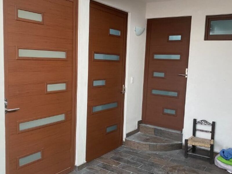 Puertas para recámara en línea nacional color nogal (madera) con cristal claro esmerilado de 6mm. Cotiza sin compromiso.