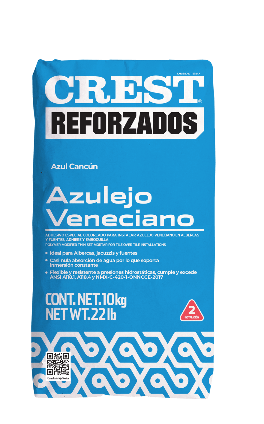 Adhesivo base cemento portland pigmentado, modificado con resinas en polvo, aditivos químicos y microbicidas, especialmente diseñado para doble función adhiere y emboquilla recubrimientos venecianos, cerámicos, porcelánicos y pétreos de alta, media, baja y nula absorción de agua, en instalaciones como albercas, jacuzzis, fuentes, etc.