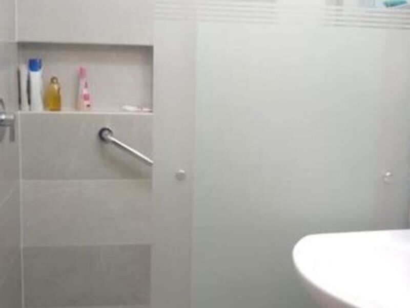 CANCEL DE BAÑO: sistema rio bravo con vidrio templado 6mm y esmeril diseño franja