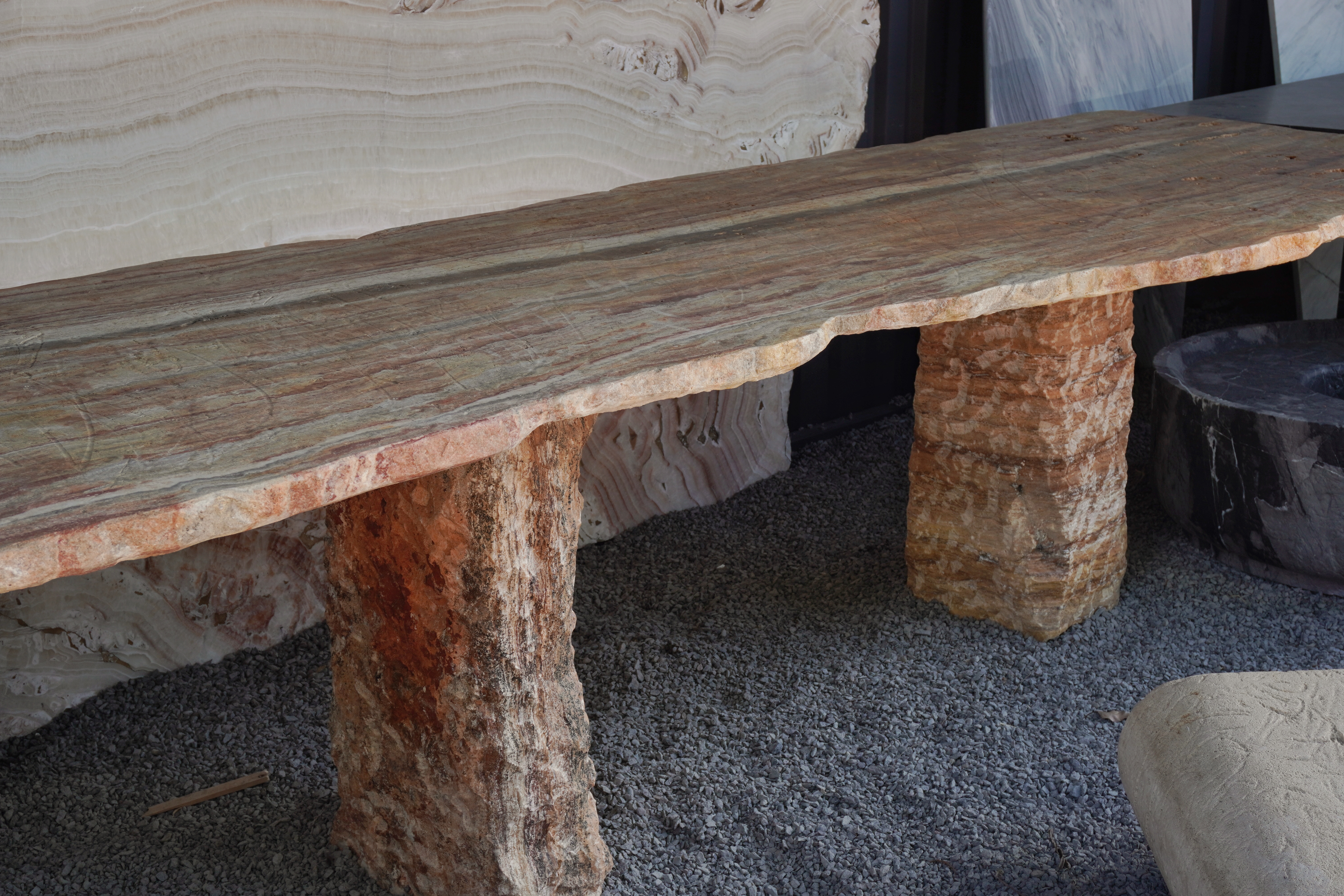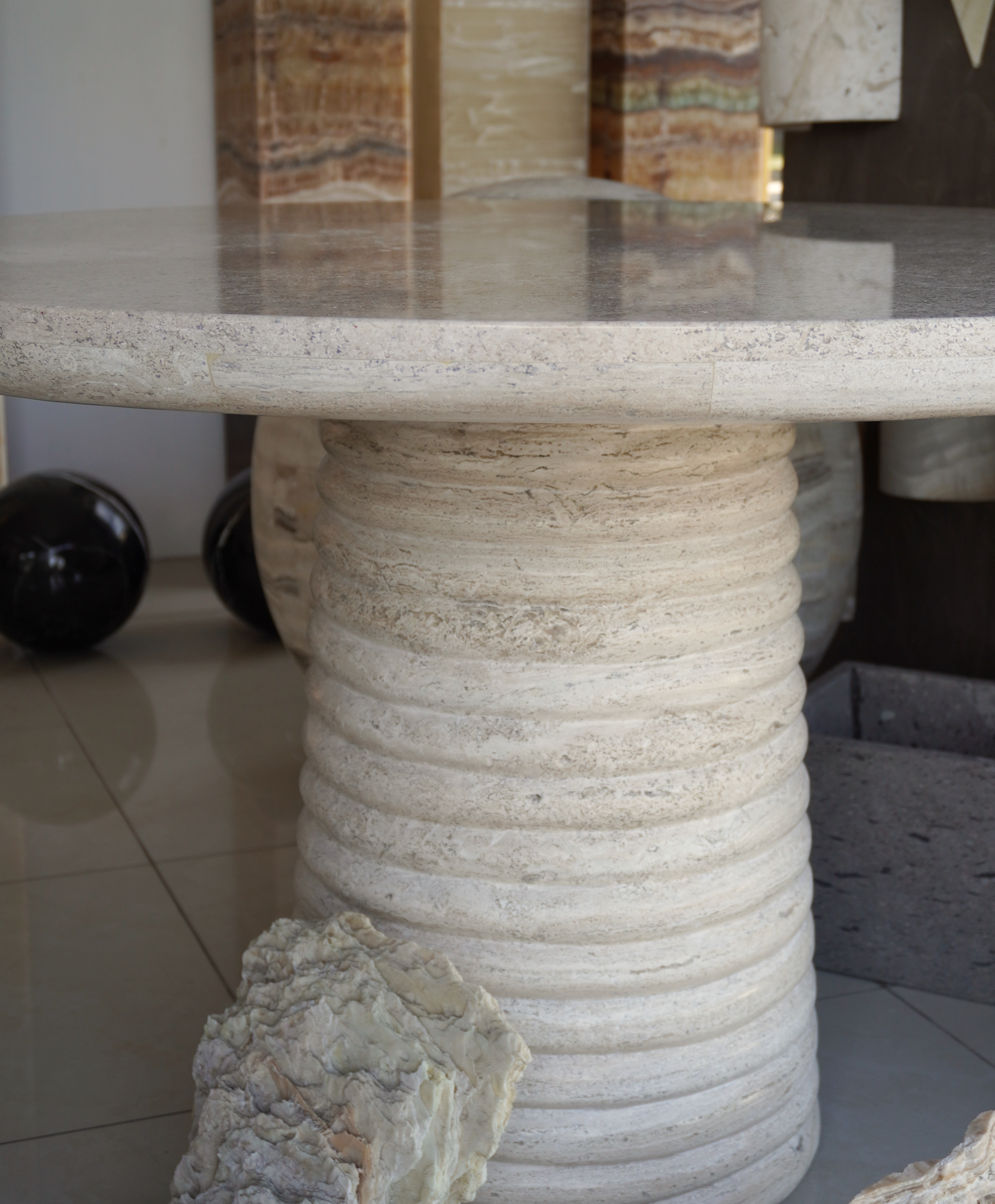 Pueden ser diseñadas en travertino, mármol, ónix, haciendo visibles sus vetas y tonos naturales, por lo que cada mesa es única. Son piezas sólidas, duraderas y fáciles de cuidar, ideales para exterior, interior, espacios que buscan un toque elegante y auténtico.