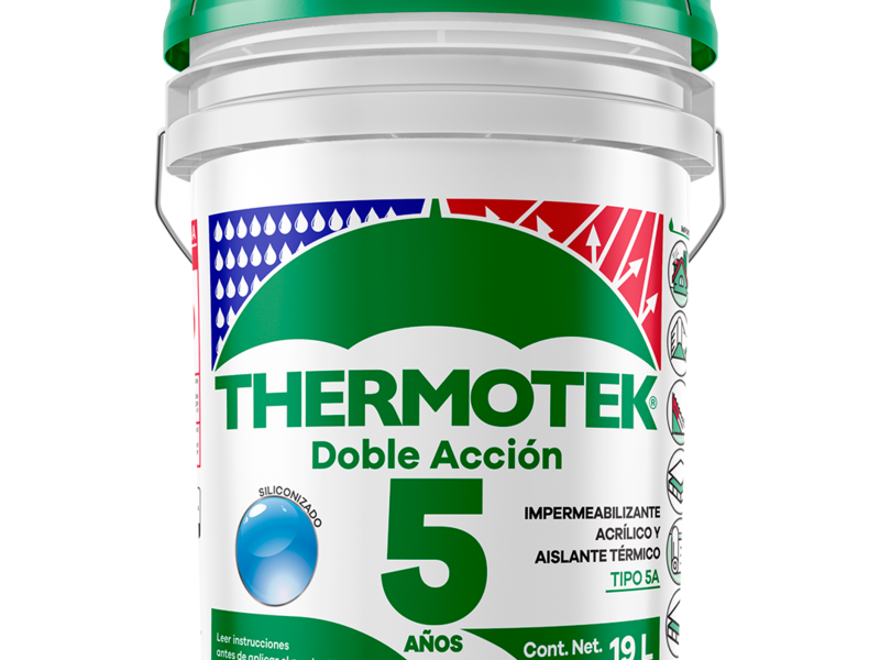 THERMOTEK® DOBLE ACCIÓN impermeabilizante y aislante térmico acrílico elastomérico, en emulsión acuosa, de aplicación en frío. Elaborado con resinas estiren – acrílicas que brindan excelentes características de adherencia, elasticidad y durabilidad con cargas de partículas cerámicas térmicas, que confieren características de reflectancia solar y aislamiento térmico.