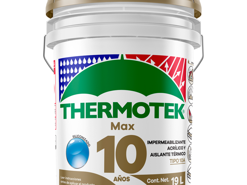 THERMOTEK® MAX 10 Es un impermeabilizante y aislante térmico acrílico elastomérico, en emulsión acuosa, de aplicación en frío. Elaborado con resinas estiren – acrílicas que brindan excelentes características de adherencia, elasticidad y durabilidad con cargas de partículas cerámicas de gran resistencia a la conductividad térmica, confiriéndole características de reflectividad y aislamiento térmico.