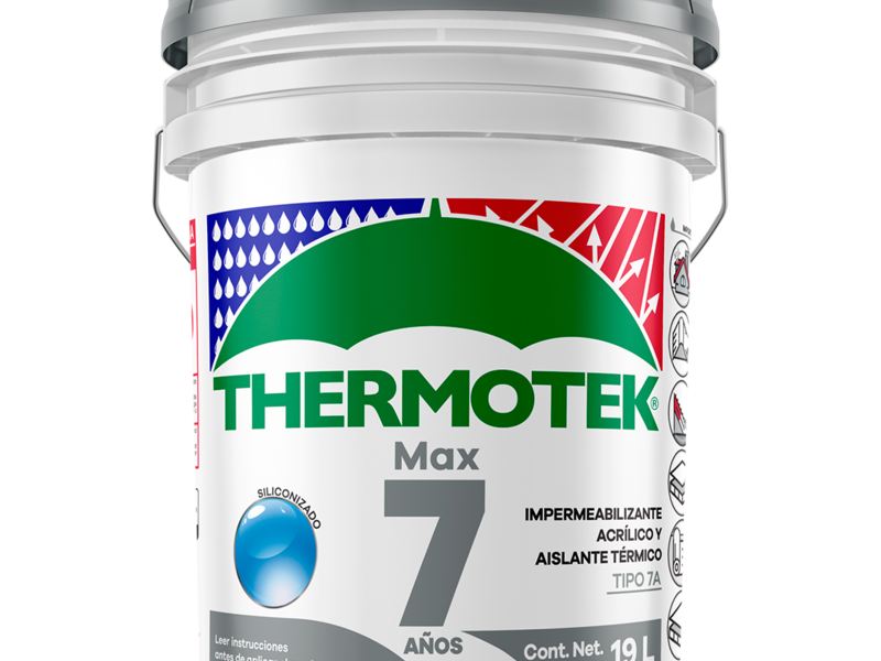THERMOTEK® MAX 7 impermeabilizante y aislante térmico acrílico elastomérico, en emulsión acuosa de aplicación en frío. Elaborado con resinas estiren – acrílicas que brindan excelentes características de adherencia, elasticidad y durabilidad con cargas de partículas cerámicas térmicas, que confieren características de reflectancia solar y aislamiento térmico.