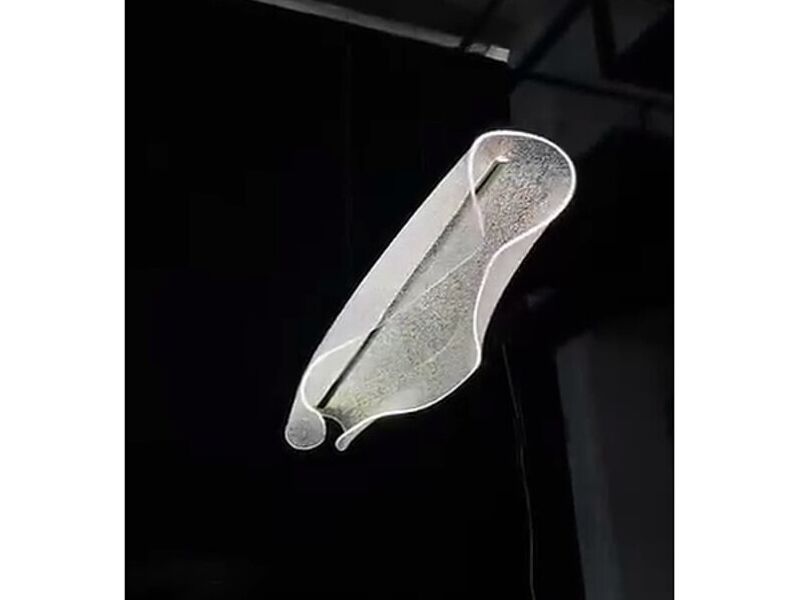 La forma que se muestra en la imagen es una lámpara o luminaria moderna de estilo minimalista y elegante. Tiene una forma alargada y curvada que recuerda a una hoja o una pluma. La lámpara está hecha de un material translúcido, posiblemente vidrio o acrílico, que le da una apariencia suave y etérea cuando está iluminada. La superficie parece texturizada o con un patrón ondulado que difunde la luz de manera delicada. La lámpara está suspendida de manera que cuelga de forma elegante en el espacio, creando una presencia escultural. El fondo oscuro resalta su forma iluminada y realza su aspecto ligero y flotante.