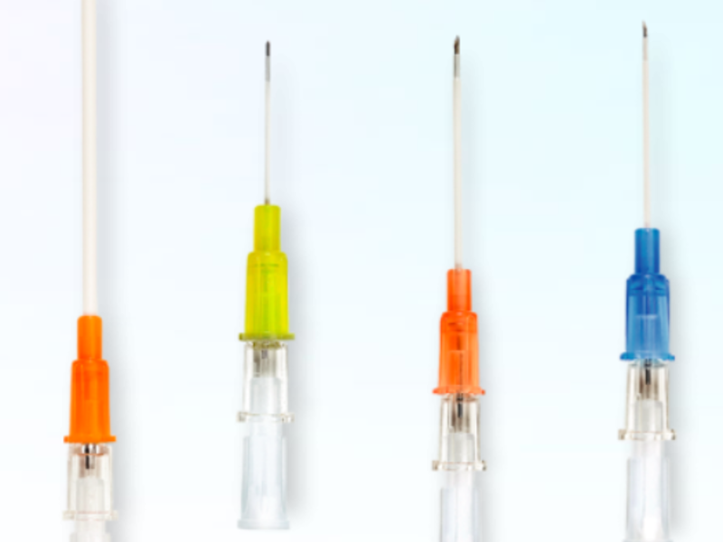 Catéter Intravenoso periférico corto, con suave desvanecimiento en la punta y ajuste firme sobre el tubo de la aguja de punción para formar una sola unidad.