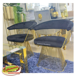 Eleva la elegancia de tu hogar con nuestras sillas de diseño exclusivo. Combinan la sofisticación del terciopelo negro con la modernidad del metal dorado.