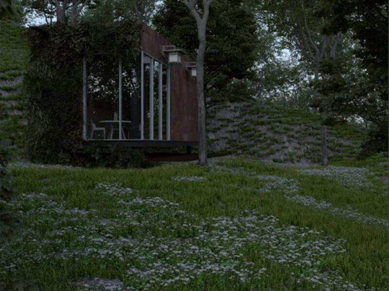 Este encantador estudio, ubicado en medio de una pintoresca zona boscosa, ha sido diseñado con un enfoque cálido y tradicional que refleja la serenidad de su entorno. Inspirado en el estilo de cabaña, el diseño abraza la arquitectura rústica y la fusión con la naturaleza circundante. El exterior presenta paredes de madera natural y detalles de piedra que se integran armoniosamente con el paisaje boscoso.