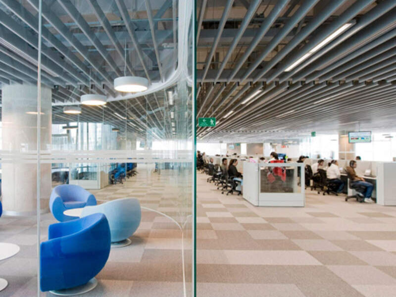 El diseño de estas oficinas para un call center se ha concebido con una visión clara de fomentar la eficiencia y la colaboración mientras se mantiene un entorno visualmente abierto. Las mamparas de vidrio, estratégicamente colocadas, dividen las estancias sin comprometer la sensación de amplitud y luminosidad.