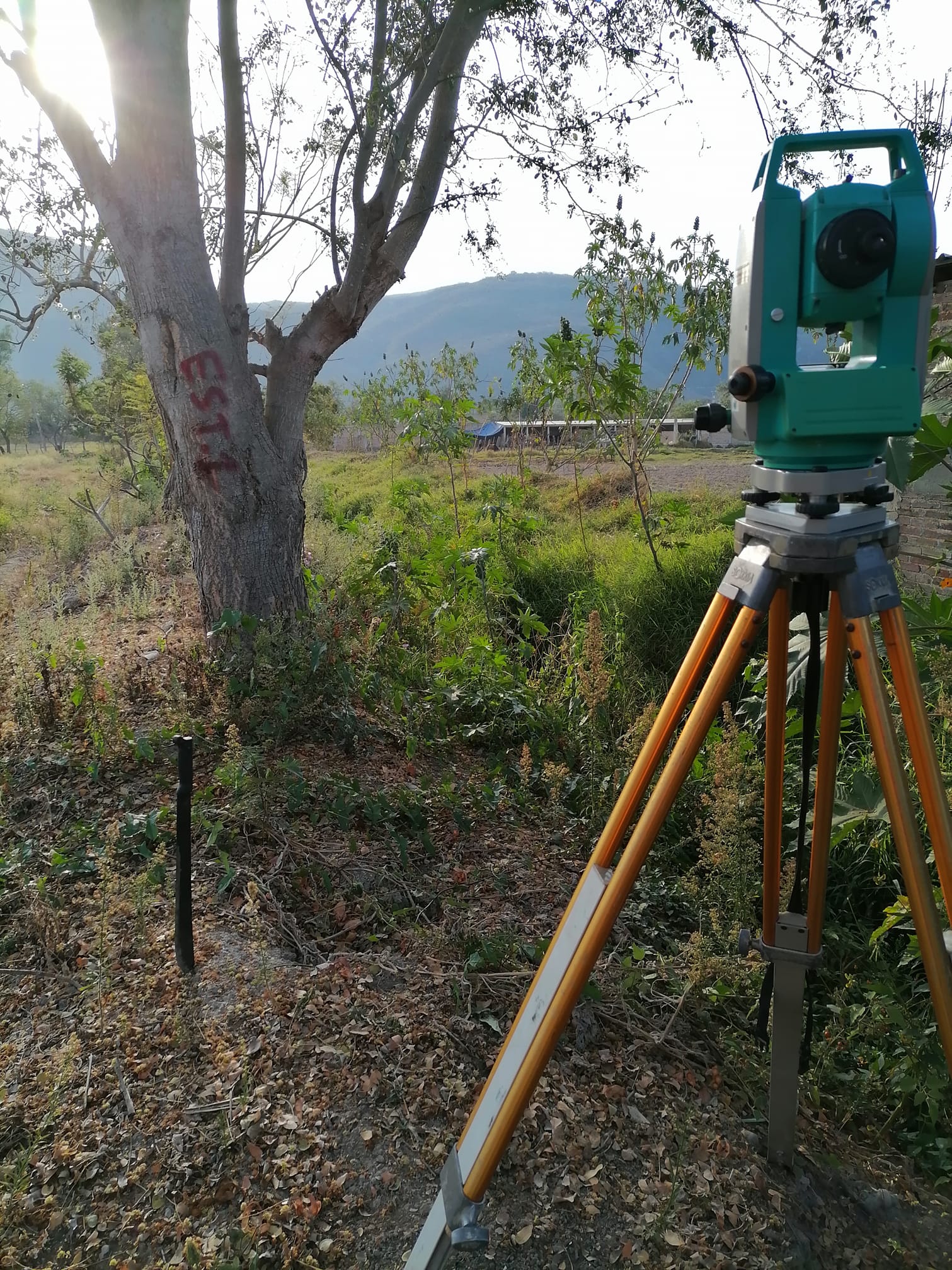 Estación total utilizada en trabajos de topografía, ideal para la medición precisa de distancias y ángulos en proyectos de construcción, ingeniería y arquitectura. Permite la creación de mapas y modelos 3D del terreno.