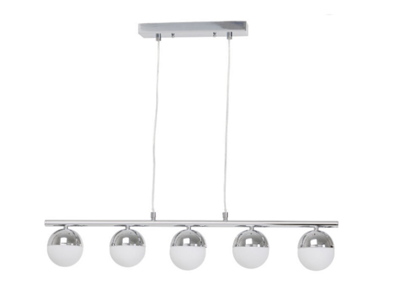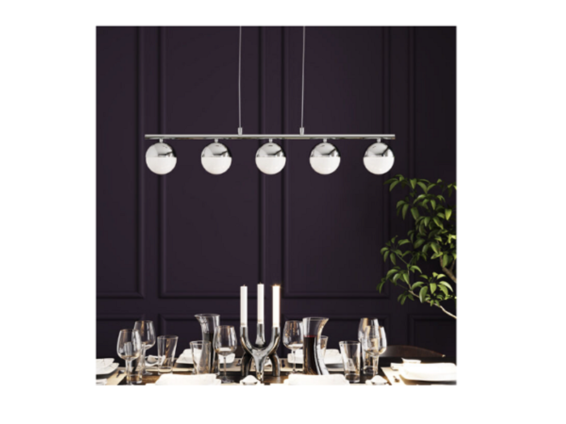 A veces puede ser menos para conseguir más efectos al diseñar una habitación. Es el caso de esta luminaria colgante purista, cuyo eficaz diseño se reduce a lo esencial. El cromo frío se une al vidrio lechoso en formas simples y geométricas. Con su anchura de 130 cm, la lámpara se adapta perfectamente a las mesas rectangulares del comedor. Su estilo complementa las mesas de comedor modernas de color blanco o negro, al igual que las mesas de madera. Una compra que seguramente disfrutará durante mucho tiempo. La bombilla no está incluida en la entrega. 230 V, 50/60 Hz, Portalámpara G9, Número de bombillas 5, max. 25 Vatios, Bombilla no incluida