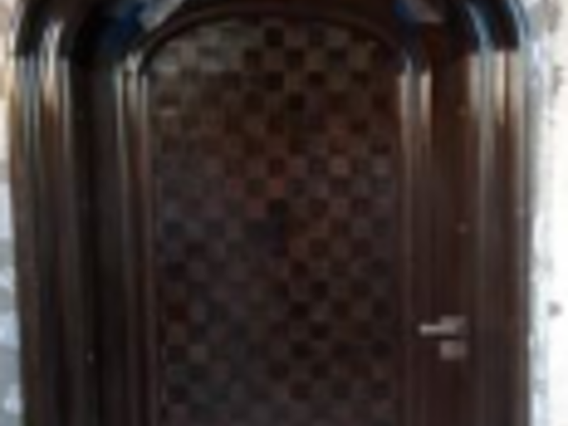 Entrada principal de la casa fabricada con madera, proporcionando un punto focal estético y de seguridad para la vivienda.