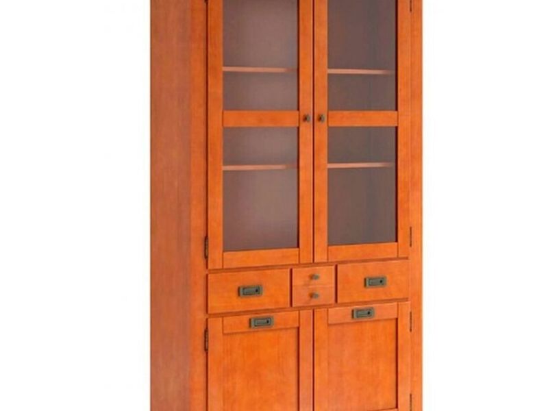 Vitrina colonial alta disponible en blanco o nogal. Esta bonita y elegante vitrina, combina la madera de pino maciza lacada en blanco o en chapa natural de nogal, junto con el cristal de las puertas, dejando ver su interior. Esta vitrina de líneas rectas es perfecta para ambientes contemporáneos y coloniales en los que nos será de fácil combinación. Esta vitrina está formada por cuatro puertas y tres cajones, que nos aportan gran espacio útil en el que podremos exponer nuestra vajilla o cristalería como parte de la decoración de nuestro hogar.