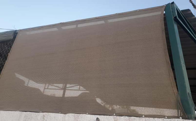 Esta lona está sujeta con tornillos, y hay una sombra rectangular visible a través de la lona. esta hecha de un material resistente y duradero se utiliza para proteger del sol o la lluvia.
