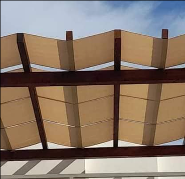 Pérgola de madera con un techo de lona beige. La lona está colocada en forma de zig-zag, creando un patrón interesante.
