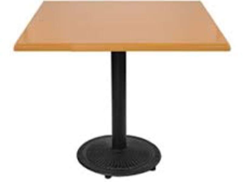 Mesa restaurantera con cubierta redonda o cuadrada en melamina 28mm. y canto PVC, estructura metálica con base plana cuadrada placa de 50*50, soporte vertical de 3″, cal. 18.