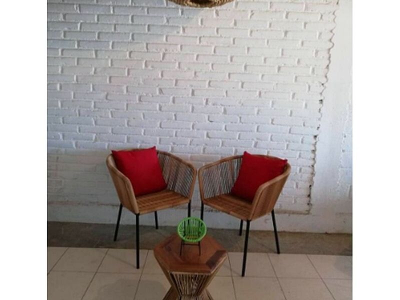 Quieres disfrutar de un buen café o tener un charla amena, hazlo en este bonito juego de sillas y mesa tejido a mano en mimbre sintetico.