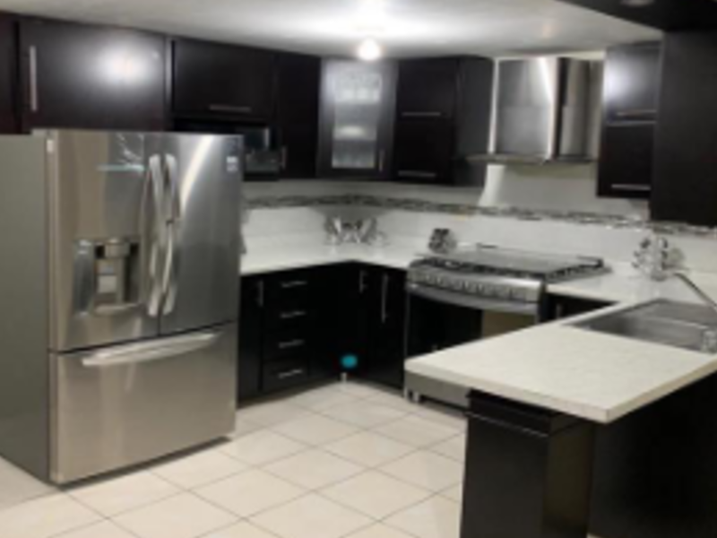 Mueble de cocina contemporáneo, posiblemente con acabados en melamina o lacado. Puede incluir gabinetes superiores e inferiores, con un diseño moderno y funcional.