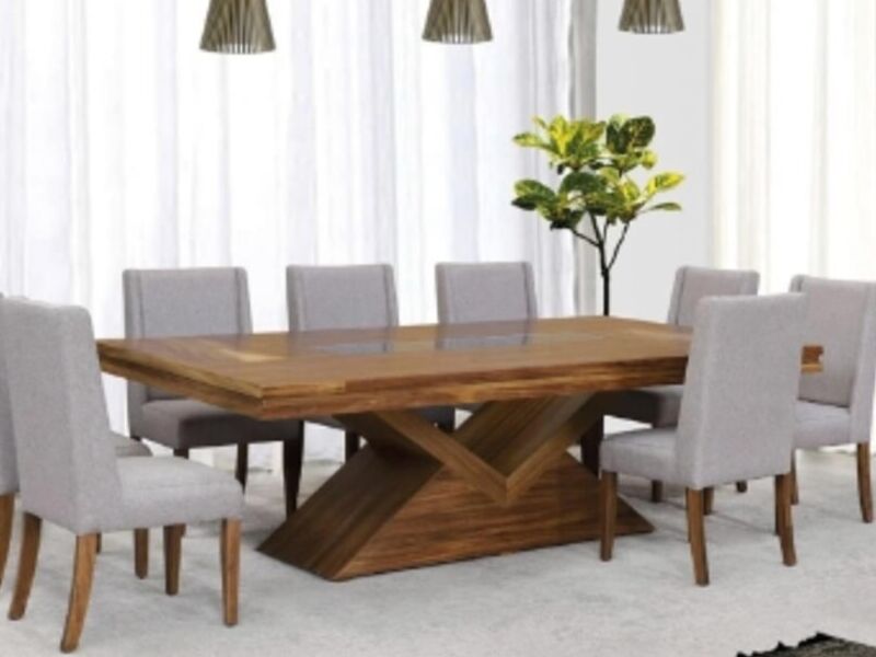 Hemoso comedor con mesa rectangular para 10 personas, mesa de madera y sillas tapizadas de color blanco.