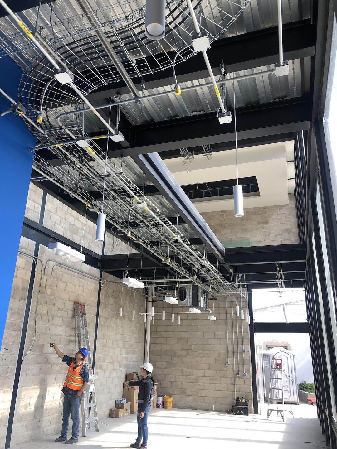 QDT Instalaciones ofrece soluciones integrales y profesionales para la infraestructura de edificaciones, abarcando sistemas eléctricos, de iluminación, climatización y gestión de cableado. Esta imagen ilustra una instalación de alta calidad con canaletas portacables tipo rejilla, tuberías conduit visibles, luminarias colgantes modernas y unidades de aire acondicionado, integradas armoniosamente en un diseño de techo expuesto. Estas soluciones están diseñadas para optimizar la funcionalidad, seguridad y estética de espacios comerciales, industriales y de oficinas, siendo ideales para arquitectos, ingenieros y contratistas que buscan eficiencia y un acabado profesional en sus proyectos de construcción y diseño interior.