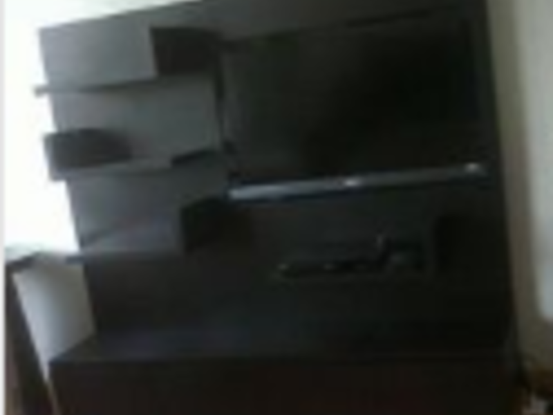 Mueble diseñado para sostener el televisor y otros dispositivos electrónicos. Fabricado en madera con compartimentos para almacenamiento y organización.