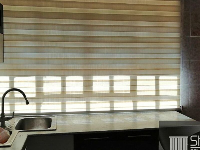Persiana horizontal duo line color beige para ventanas de cocina.