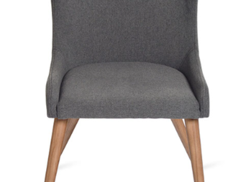 Silla tapizada en tela con base de madera color nogal.