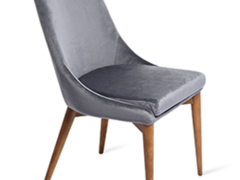 Silla tapizada en tela tipo terciopelo con base de madera color nogal.