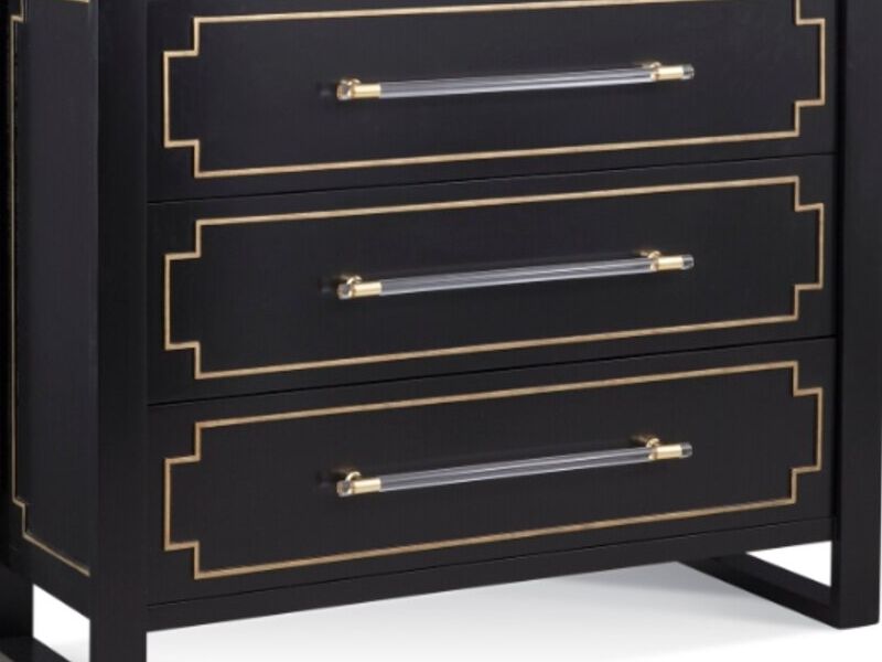 La cómoda del recibidor Lowery presenta un acabado lacado negro suave en la caja y cajones con adornos dorados en los cajones, acrílico y herrajes con barra dorada.