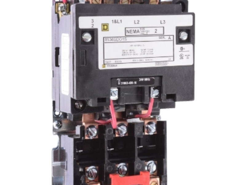 Los arrancadores de motor NEMA tipo S se utilizan para el arranque y parada de voltaje completo de motores de jaula de ardilla de CA. Los arrancadores de motor tipo S tienen clasificaciones de hasta 810 amperios. Este arrancador no inversor NEMA tamaño 2 de 3 polos tiene una clasificación de 45 amperios. Este arrancador de motor NEMA tamaño 2 tiene clasificaciones trifásicas de 10 HP a 200 VCA, 15 HP a 230 VCA y 25 HP a 460 y 575 VCA. Este arrancador de motor NEMA sin inversión tiene un relé de sobrecarga tipo aleación de fusión que utiliza unidades térmicas tipo B para detectar condiciones de sobrecorriente