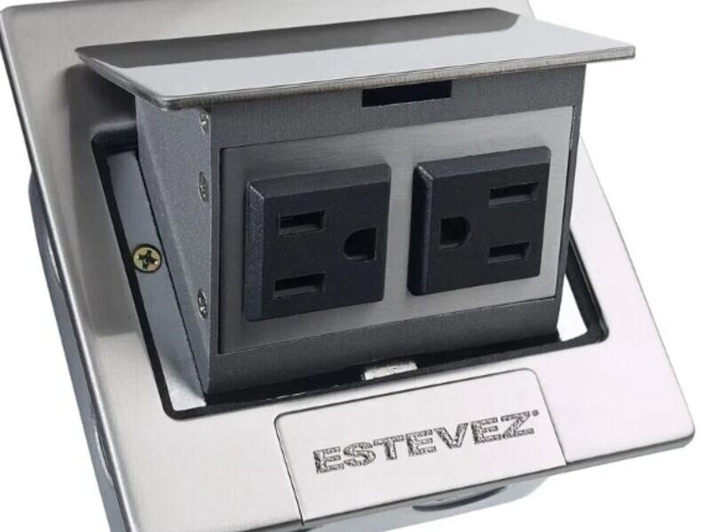 Contacto dúplex 2P+T de piso marca Estévez de 15A con cuerpo de acero inoxidable color titanio para uso en exteriores con botón Pop-Up para exponer mecanismo